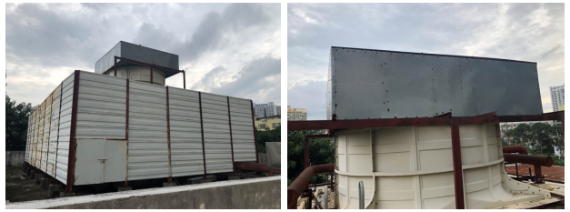 改造前为高转速动力系统,噪音大 出风口被挡住,散热效率差 冷却塔接水盘破裂