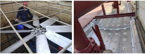安装新的冷却塔超静音风机,拆掉出风口消声器 更换新的冷却塔不锈钢接水盘